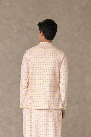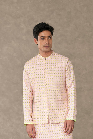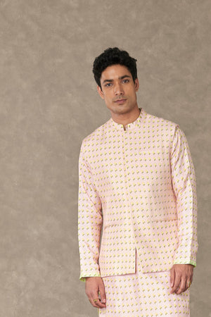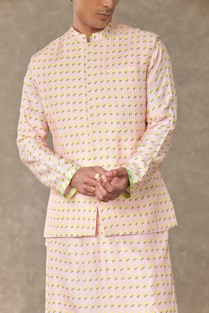 Details: Barfi Pink Wallflower Bandi - All over digital printed Bandi embellished with tone on tone dhagai kaam |Center front opening| Mandarin collar