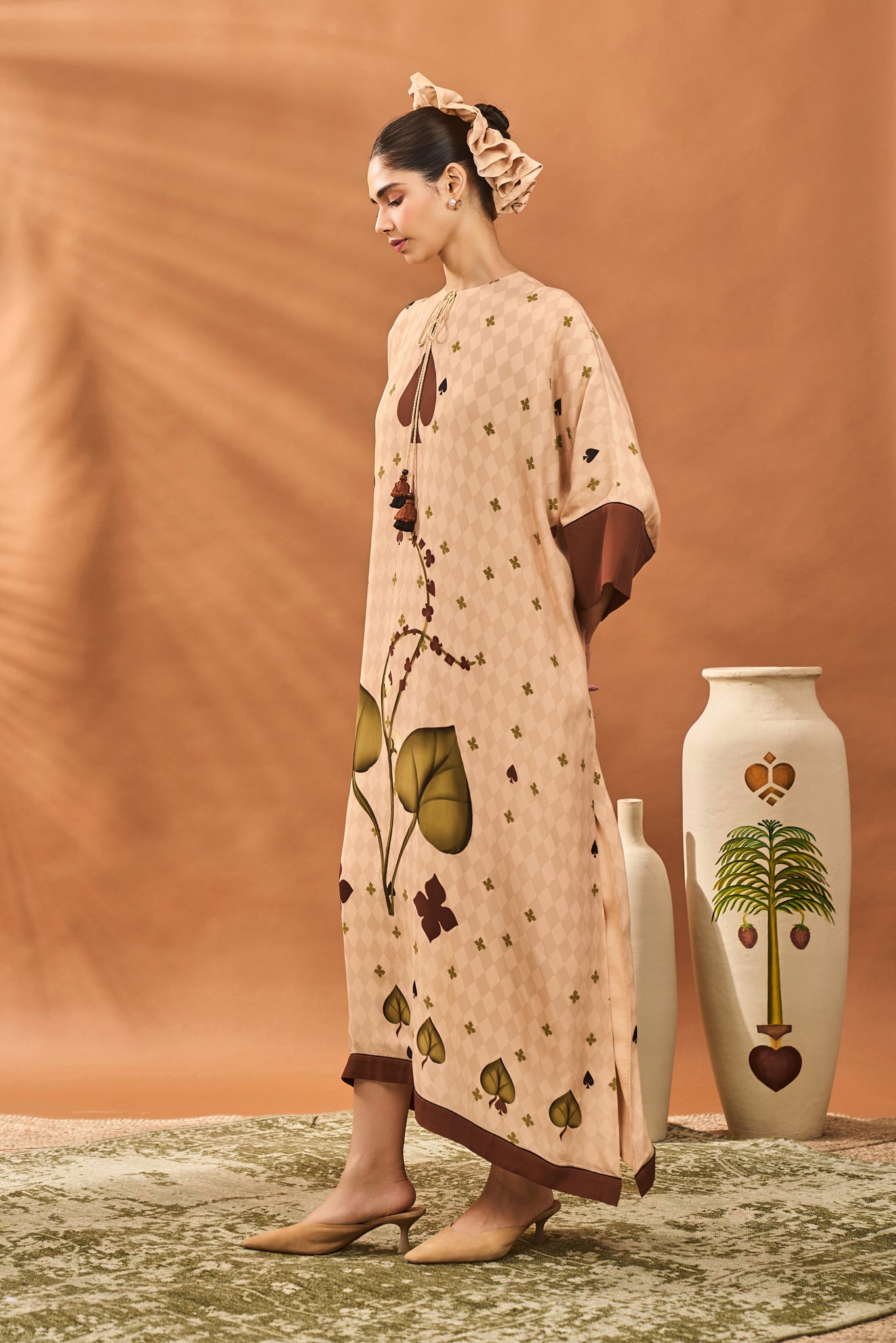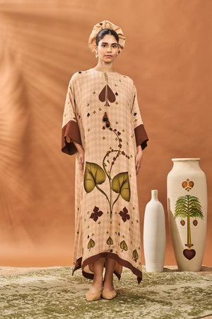 Details: Kaftan- Beige clover checks kaftan adorned with patchwork on sleeve | Asymmetrical hemline | Tie-up detailing
