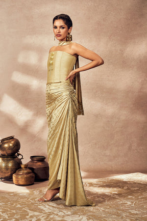 Details: Corset- Corset adorned with beautiful dori and sequin gold embroidery motif | Center back closure with adjustable dori adorned with tassel detail Drape Skirt- All over foil printed drape skirt with side seam opening Sash- Foil Printed sash with gold work detail.