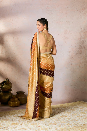 Details: Saree- Beautiful beige saree with foil printed stripe palla | Embellished with embroidered borders.