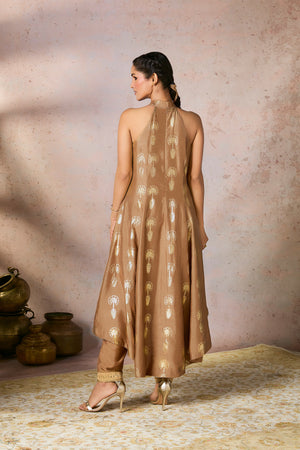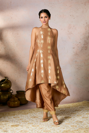Details: Tunic- Beautiful all over foil print tunic with in-cut neckline | Zero neckline and asymmetrical hem embellished with kinari | Fit and flare | Center back opening.