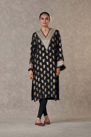Details: Black Cherrybloom Kurta - Embellished with embroidered borders | Outfit features bell sleeves and a 'V' neck | The kurta has a beautiful Cherrybloom print and comes with a black legging
