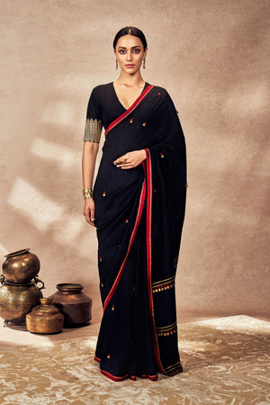 Details: Saree- Black saree embroidered with coins and gota | Contrast red border with gota kaam