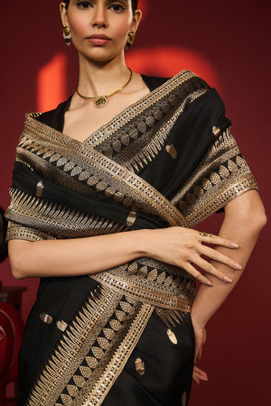 Styling: Pair this Black Gold Saree with gold or antique jewellery, bangles and mojris, add a potli bag in a coordinating color to compliment the look