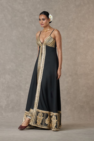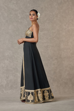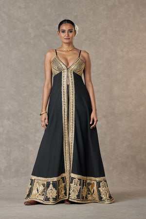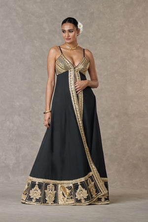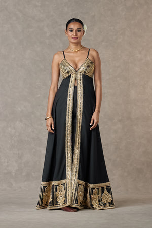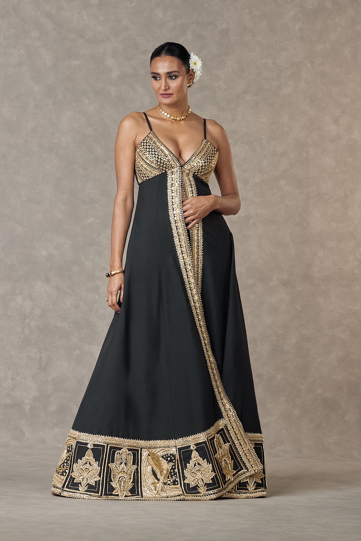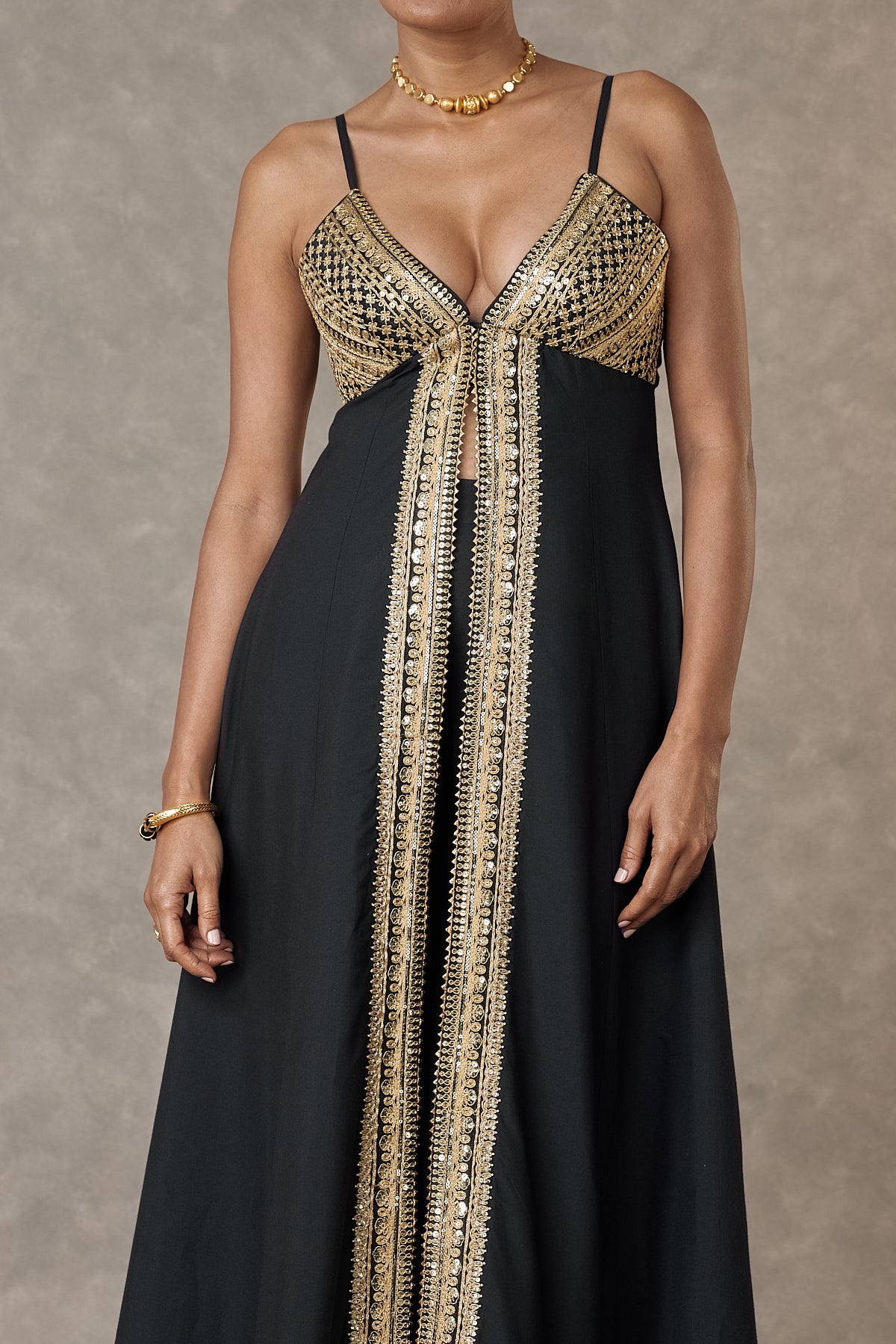 Details: Black Haathphool Fusion Set - Tunic with centre front slit embellished with our signature Haathphool motif embroidered in dori, sitara and dabka kaam | Hem is beautifully embellished with multi motifs in dori, sitara and dabka kaam | Centre front closure |Adjustable straps | Edged with kinari Pant- Pant embellished with embroidered borders | Side zip closure | Edged with kinari