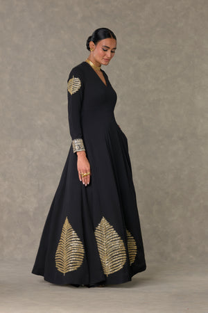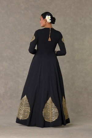 Details: Black Kashmiri Leaf Gown - Gown with Kashmiri- Patti embroidered in dori and sitara kaam along the hemline |'V' neckline | Full sleeves | Comes with attached Can Can | Center back closure