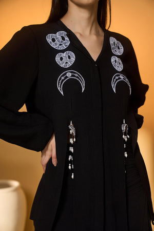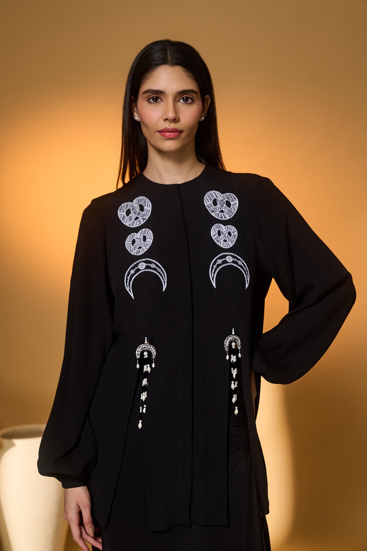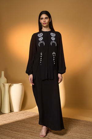 Details: Slit Shirt- Collarless shirt | 'Midnight Snack' motif embroidered on either side | Balloon Sleeves with Cuff closure | Slit Detail adorned with tassels on front | Centre-front button closure Drape Skirt | Centre-back zipper closure | Body hugging