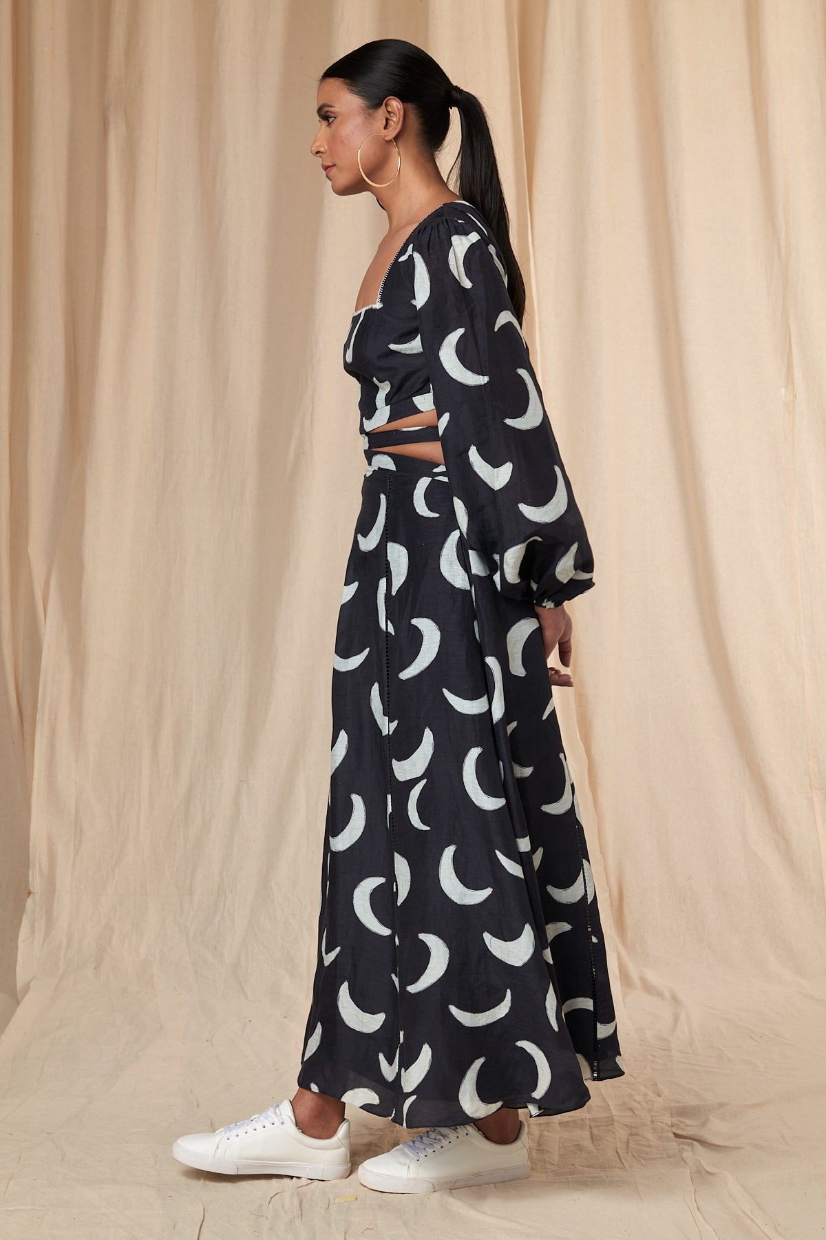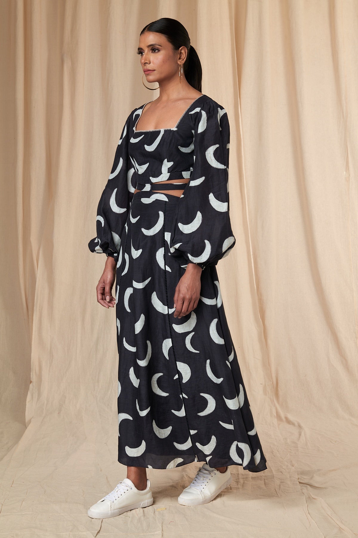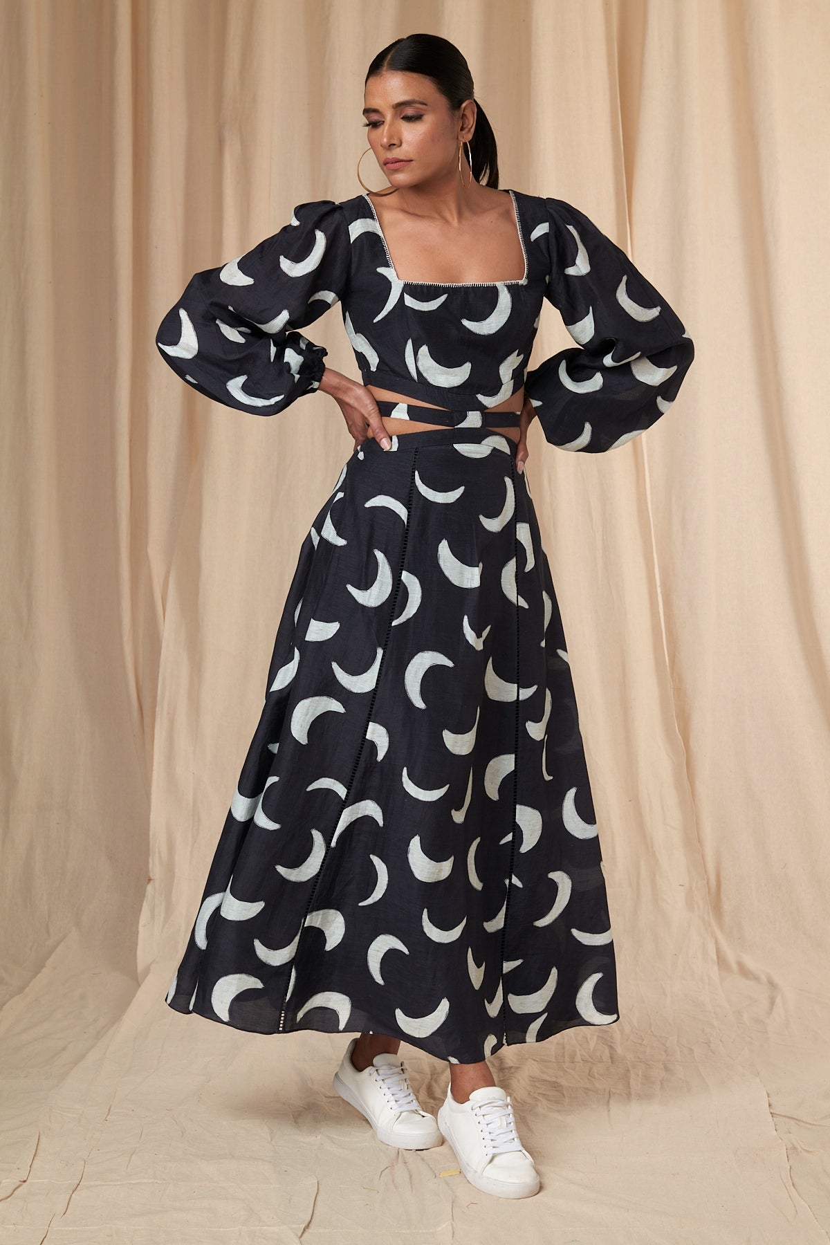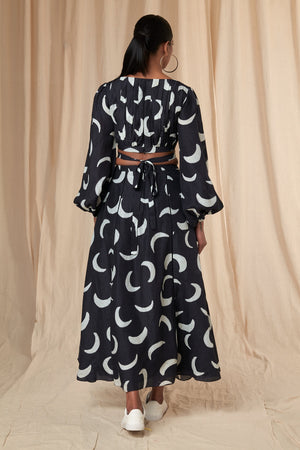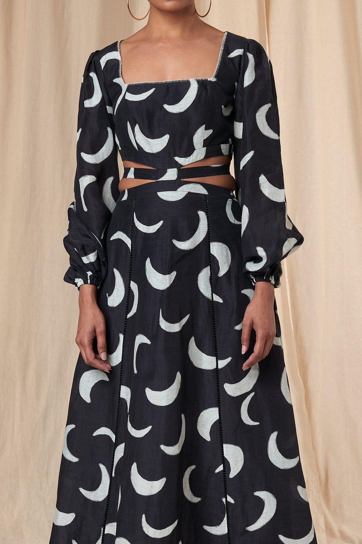 Details: Black Mooncrest Cut Out Dress - A- Line | Cut-out waist | Square Neck | Puff Sleeves | Elasticated Wrist band | Hand embroidered Blanket Stitch Neckline | Pockets