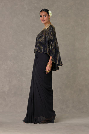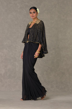 Details: Black Drape Skirt - Tube with Center back closure | Detachable straps Drape Skirt- Drape skirt with 'V' shaped waistbelt | Waistbelt embroidered with dori & Sitara kaam | Centre back closure Cape- Front Open cape with 'Neel Kamal' motif embroidered with dori, sitara & dabka work | Edged with Kinari