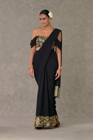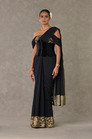 Details: Black Georgette Saree - Pre-stitched saree with side enclosure | Adorned with Neel-kamal border in dori and sitara kaam| Pinstripe gold foil finish at the back. Blouse - Off shoulder bustier with cowl sleeves | Adorned with all over intricate jhaal in dori and sitara kaam | Centre back closure Corset - Corset with front potli button enclosure and adjustable dori at the back