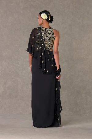 Details: Black Color Saree - 'V' Neck | n-cut sleeves | Cut out gown with attached ruffled palla adorned with pita, dori and sitara kaam| Bodice adorned in our = 'Paan-Phool' jhaal embroidery | Centre back closure