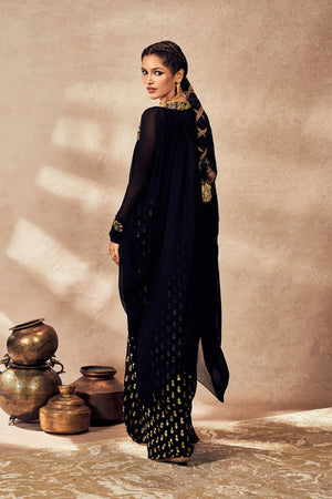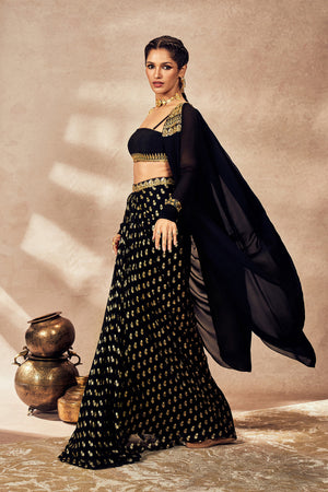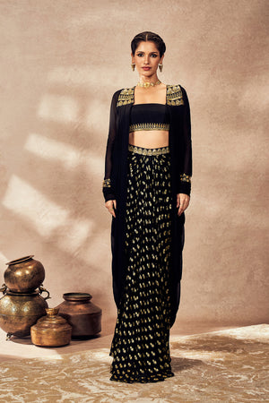 Details: Jacket- Sheer drape jacket | Yoke made with beautiful sequin and dori embroidery | Sheer chudi Sleeves Skirt- All over printed drape skirt with waistbelt embellished with embroidered border | Centre back closure Bustier- Bustier with centre back closure | Embellished with embroidered border | Detachable straps