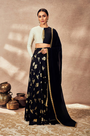Details: Blouse- Beautiful fitted blouse with half and half colour block | Adorned with gold dori and sequin center embroidery motif | Center back opening Skirt- All over foil printed skirt | Side seam opening