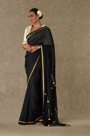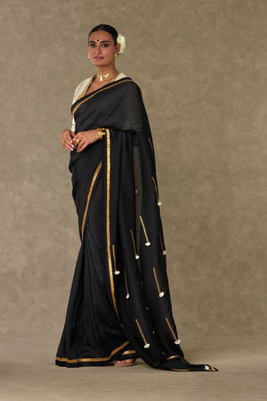 Details: Black Saree with Golden Border - Palla embroidered with accent gota tassels | Edged with kinari Blouse piece - Embroidered linen blouse piece