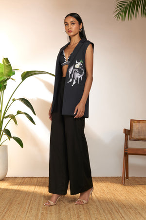 Details: Black Tropicool Sleeveless Blazer - Sleeveless | Notch collar |Placement print