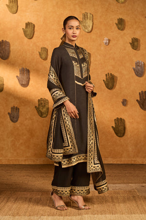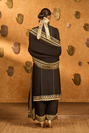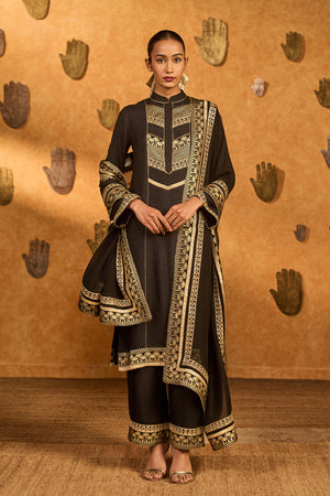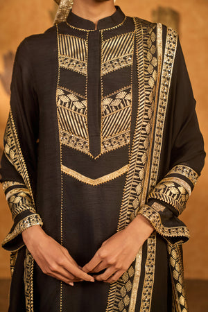 Details: Kurta- Straight kurta adorned with beautiful yoke made with foil printed and embroidered borders | Kinari gota detailing | Mandarin Collar with Placket | Center Front opening | Pinstripe foil print border backing detail Pant- Straight pants adorned with foil printed and embroidered borders with kinari gota | Side Seam Closure Dupatta- Plain dupatta embellished with kinari gota and foil printed borders | Pinstripe foil border backing detail