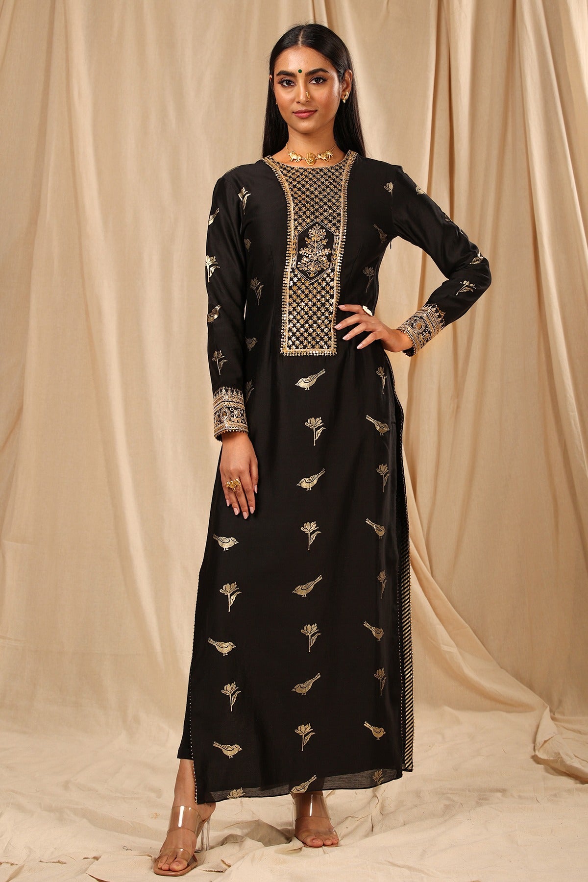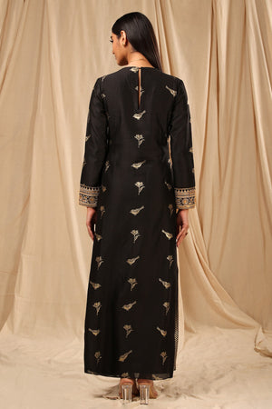 Details: Black Vintage Fiona Kurta - Pick this Black Chanderi Silk long kurta with a high neck to dazzle at a special occasion! Adorned with aari embroidery and embellished with embroidered borders, the outfit features full sleeves and high slits and back opening. The kurta has beautiful Vintage Fiona foil print and comes with a Black Legging.