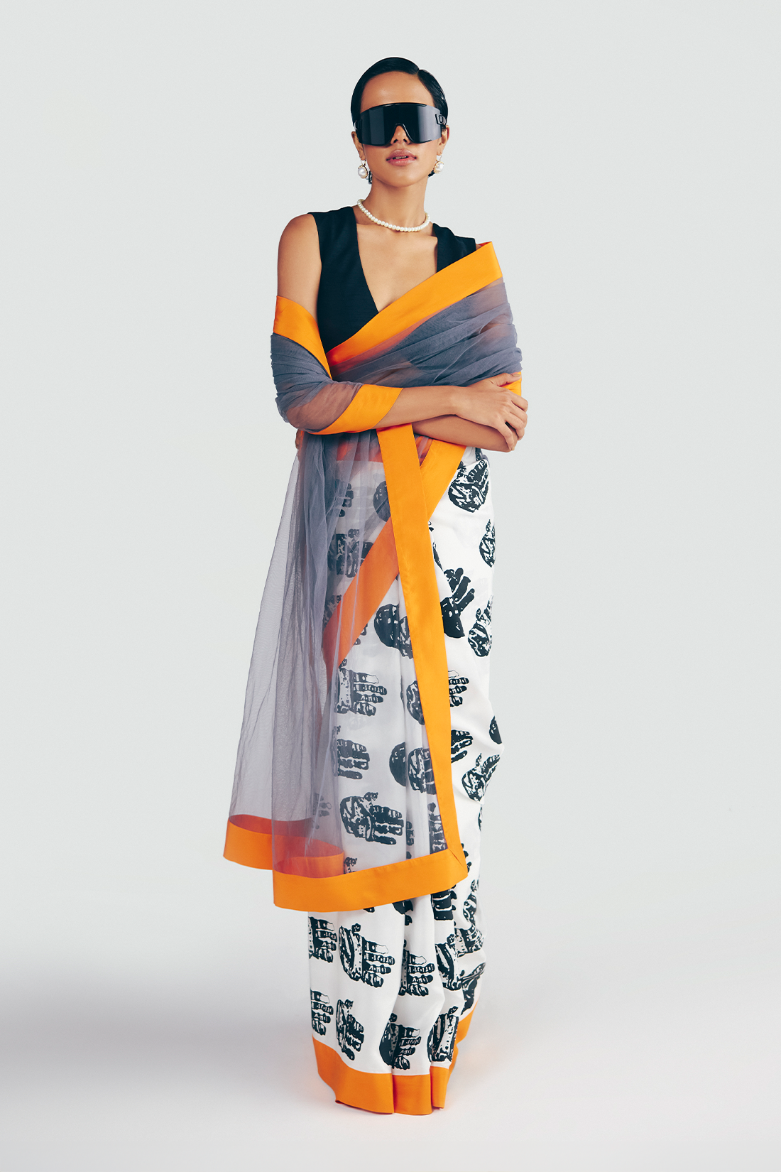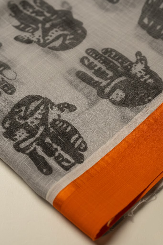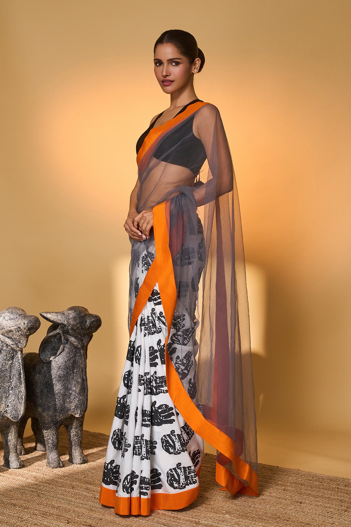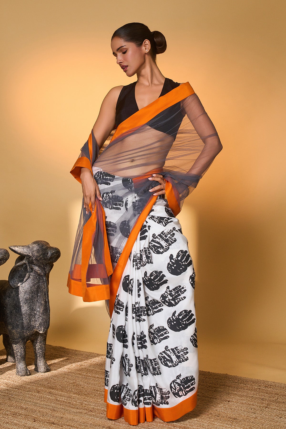 Details: Saree – The Pallu is made with net | Pleats have khadi print with a palm print in pure Habutai silk fabric | The entire saree is completed with an orange Habutai silk border to add a contrasting touch to the black and white saree. Blouse – The blouse is in raw silk fabric.
