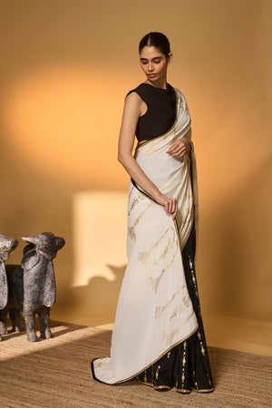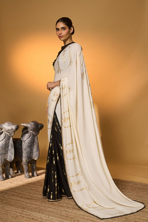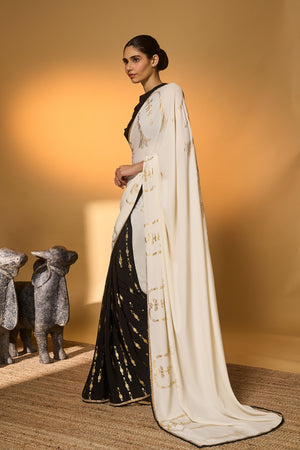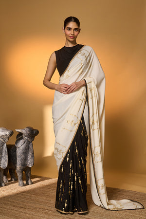 Details: Saree – an elegant half-and-half foil printed saree | pallu adorned with palm tree foil prints | pleats featuring an all-over tribal pillar foil print | embellished with a handmade sequin lace for a touch of shimmer Blouse – black Viscose Crepe blouse piece