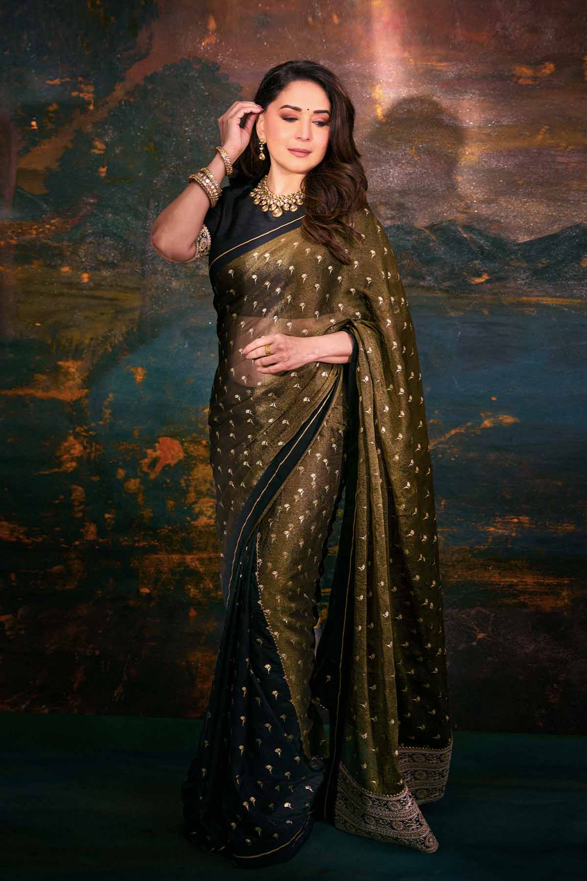 Details: Black Tissue Saree - All over foil printed saree| Embellished with embroidered borders| Tissue palla Blouse piece - Embroidered raw silk blouse piece