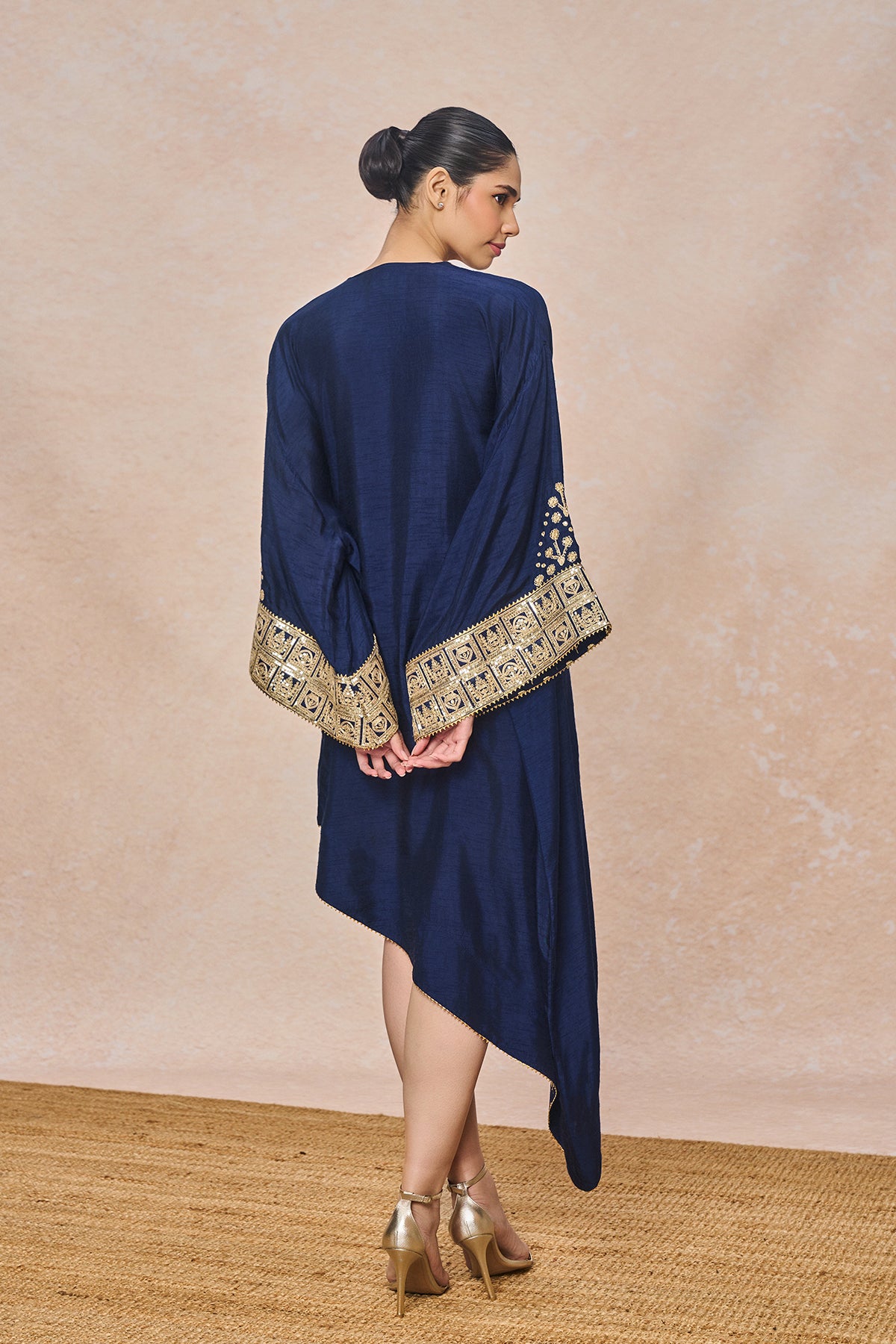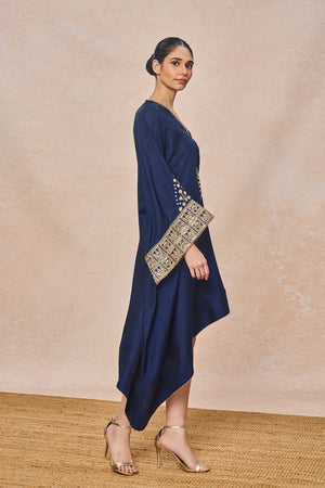 Details: Blue Embroidered Kaftan - With Slip | Embroidered kaftan with embellished sleeve & neckline | Asymmetrical hem