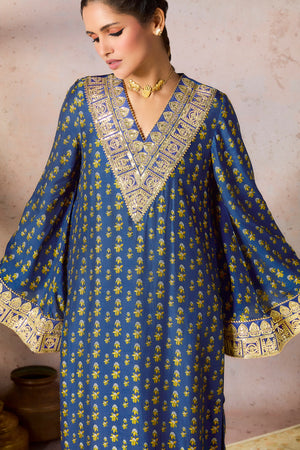 Details: Tunic- Beautiful all over print straight kurta with flared sleeves | 'V' neckline and sleeves embellished with embroidered borders and edged with kinari | Calf-length Pant- Narrow Pants embellished with embroidered borders | Side seam closure