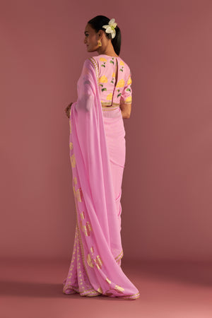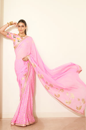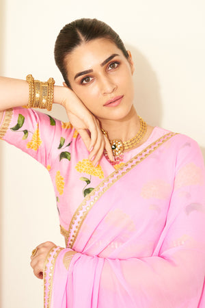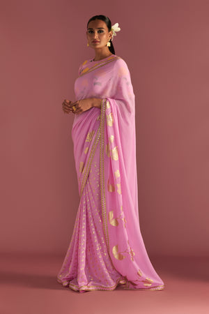 Details: Bush Pink Silk Saree - Placement foil print | Embroidered border | Digital printed blouse piece