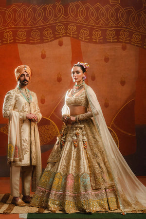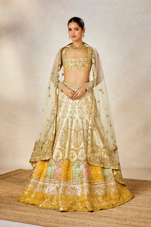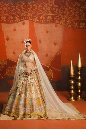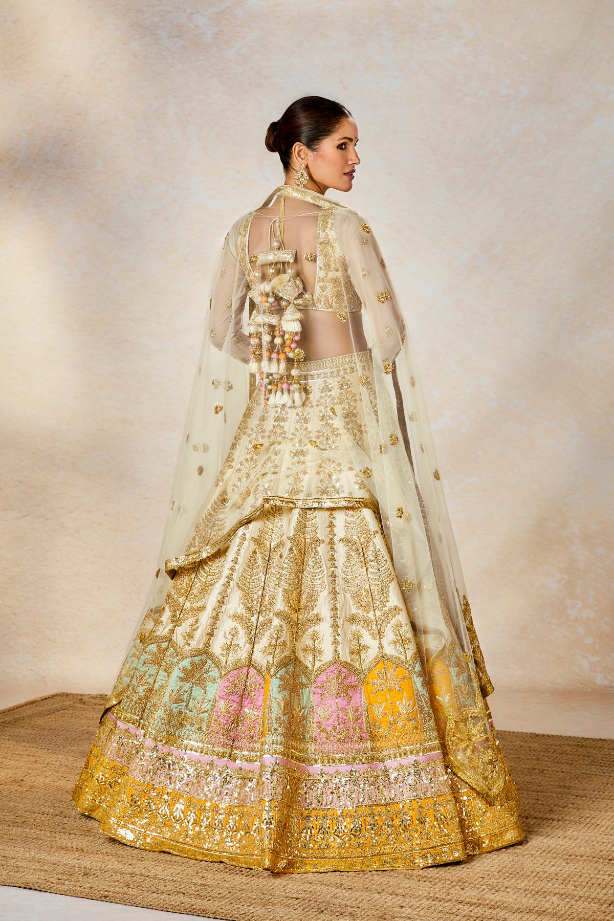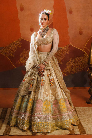 Description: The colorful Bombay Barfi lehenga is brought to life on a creamy silk with the help of our 'Gul Jharokha' motif sitting at the base. This motif has been carefully appliqued in the varying sorbet shades in the shape of dainty windows and further intricately embroidered with bright gold. It is paired with an ornate gold blouse and a flowy sheer dupatta that drapes like a dream, making this ensemble perfect for brides.