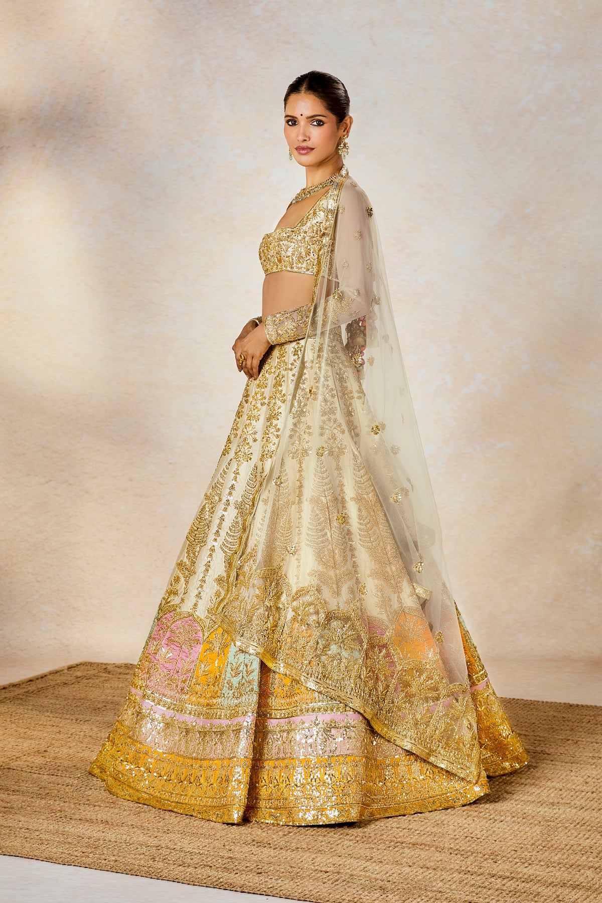 Details: Lehenga- Lehenga embellished with 'Gul Jharoka' and 'Amaltas' motif in gold dori, sitara, badla and dabka kaam | Applique colour blocked embroidery | 18 Kalis | Contrast colour blocked border with embroidery and edged with kinari |Pocket detail | Side zip closure | Comes with a separate Can Can skirt Blouse- Square neckline | Full sleeves | Net Sleeves |Center back opening with tie-up tassel detail | Printed lining | Open back Dupatta- Net body dupatta embroidered with 'Gul Jharoka' and lampi gota border edging Optional Dupatta- Organza dupatta embroidered with 'Amaltas' motifs | Embellished with contrast embroidered borders and edged with jhallar|Printed backing |Tassel detail