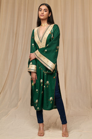 Details: Bottle Green Buttercup Kurta - Pick this Bottle Green Raw Silk kurta with V-neck to dazzle at a special occasion! Embellished with embroidered borders, the outfit features bell sleeves and side slits.