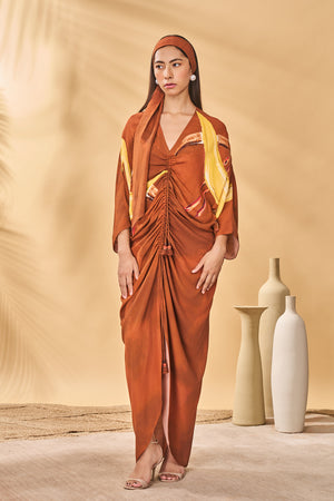 Brown Feathered Cinched Kaftan