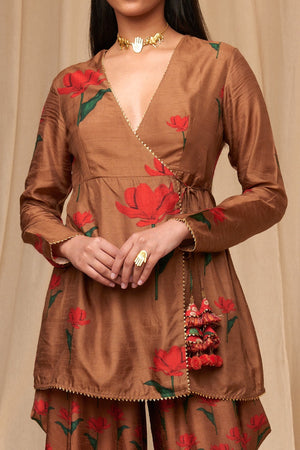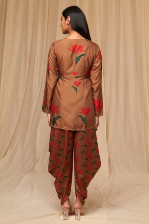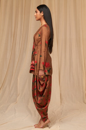 Details: This Brown Raw Silk Fusion Set comes with Angrakha which has a beautiful Wine Garden print and is edged with kinari and has beautiful tie-up with tassel detail which adds oomph factor to your figure! Cowl dhoti has a beautiful Wine Garden print & is edged with kinari.