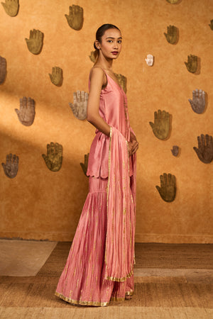 Details: This champagne pink sharara set is crafted in rich raw silk, featuring delicate Sona chandi foil work across the flared sharara and scalloped hem kurta. The kurta’s strappy neckline adds a soft, modern femininity, while intricate foil-printed motifs bring traditional charm to the contemporary silhouette. It is paired with a sheer organza dupatta, beautifully finished in a soft gold-to-silver ombré foil effect, adding a subtle shimmer and elevating the ensemble’s festive elegance.