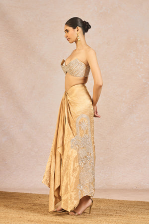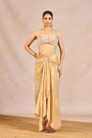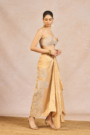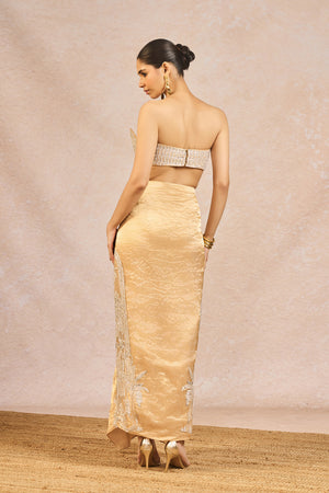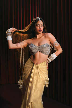 Description: The ‘CHANDNI’ FUSION SET is crafted from elegant gold tissue fabric, this ensemble showcases refined craftsmanship and understated grandeur. Delicate silver embroidery—featuring intricate Sitara work and cutdana detailing with 'Gul Jharokha' motif —is meticulously embroidered on a veshti and bustier, adding depth and texture to the minimalist silhouette. The result is a harmonious blend of traditional detailing and contemporary form, making it an effortlessly sophisticated statement piece.