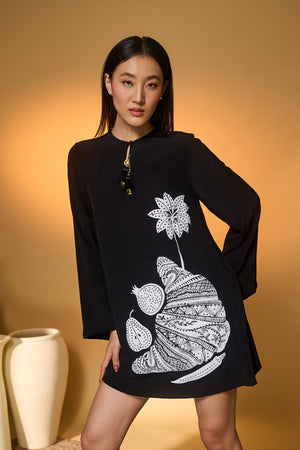 Details: Relaxed mini dress | Split Neckline with button closure adorned with tassels | Key-hole Detail | Flowy Silhouette | Bell Sleeves | Big statement placement print