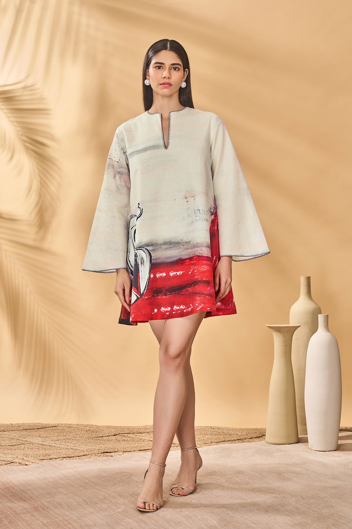 Details: Relaxed mini trapeze dress |Flowy Silhouette | V-neck| Bell Sleeves | Dancing Shadows Placement Print | Side pockets