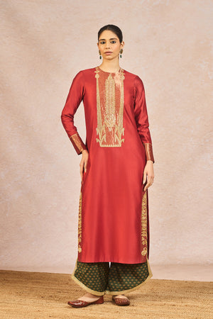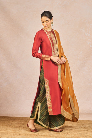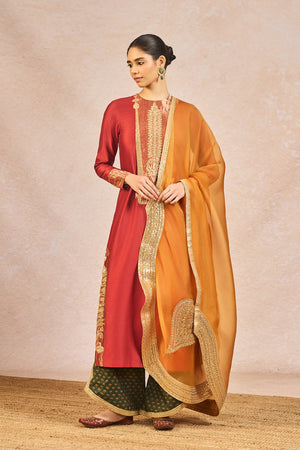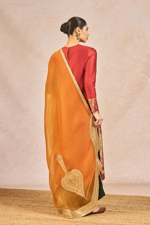 Description: This vibrant ensemble features a rust-hued kurta brought to life with delicate tissue patchwork and intricate hand embroidery with Mithi Makaai and Kashmiri Kali motifs, adding depth and richness to the silhouette. It is paired with green Olive gul rang printed pants, creating a striking and playful contrast. The yellow dupatta is adorned with dori and sitara work, catching the light with every movement. Dupatta's hem is artfully cut in the shape of paankh, lending a soft, organic charm that beautifully complements the handcrafted details of the outfit. A harmonious blend of tradition and whimsy, this look is ideal for festive celebrations.