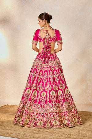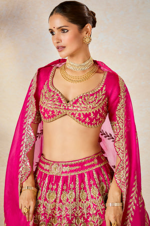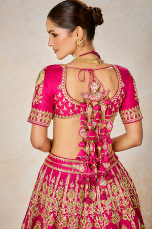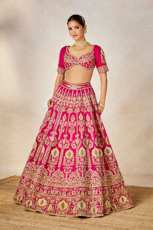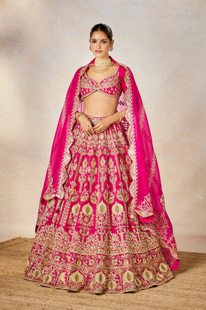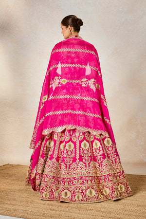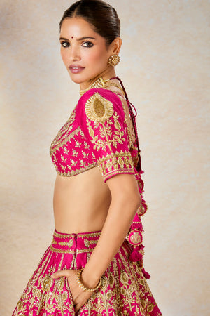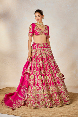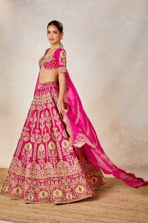 Description: The Dilli 6 lehenga is a striking bridal piece in a rich rani pink shade, featuring intricate anar pool motifs that draw inspiration from the vibrant culture and heritage of Old Delhi. The motifs evoke a sense of tradition, luxury, and the lively spirit of the city's bazaars. The lehenga is beautifully embroidered with detailed zardozi, resham, and beadwork, creating a rich, textured look. It is paired with a matching blouse that also carries the same pomegranate motifs, ensuring a cohesive and elegant design. Completing the ensemble is a delicate organza dupatta, embroidered along the borders to complement the lehenga’s intricate detailing. Comes with a separate cancan skirt.