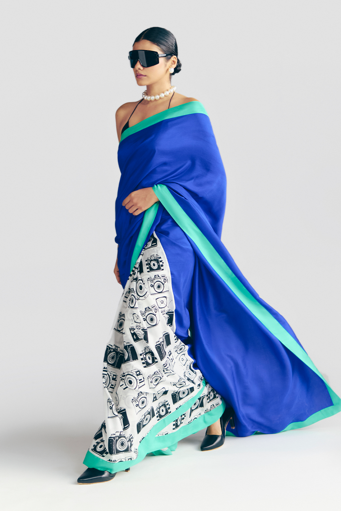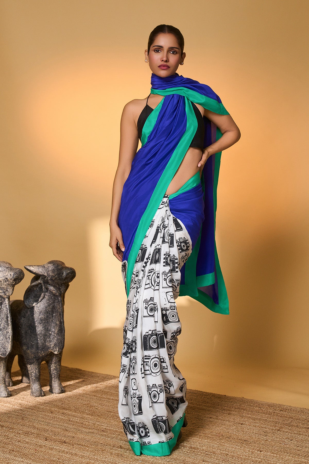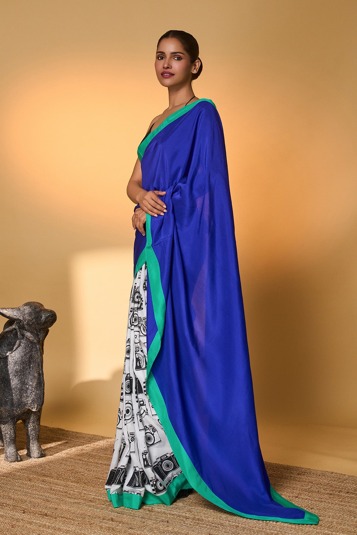 Details: Saree – The Pallu is made in pure Habutai silk in an electric blue fabric | Pleats are in camera khadi print | The saree is completed with a green Habutai silk border, making it a contrasting saree. Blouse – The blouse is in raw silk fabric.