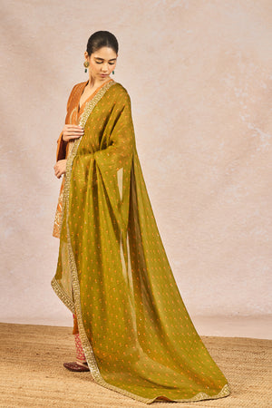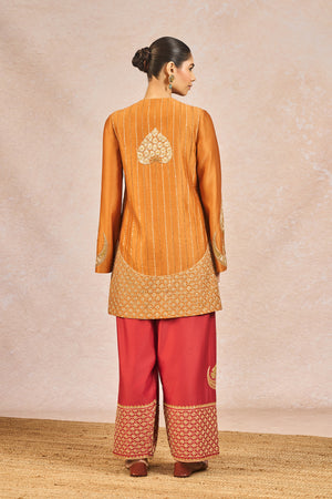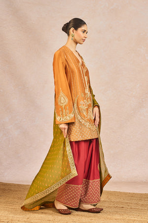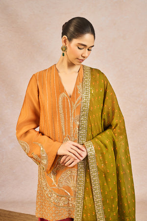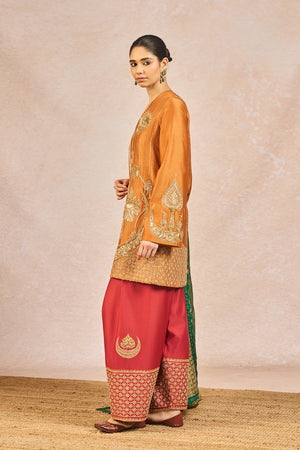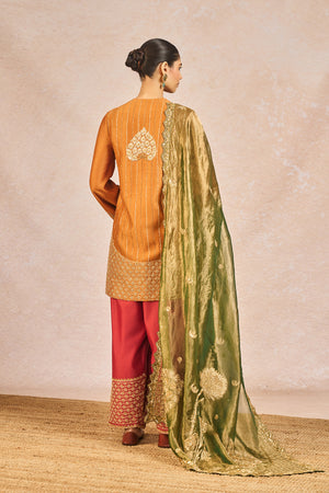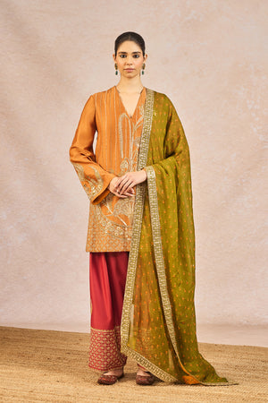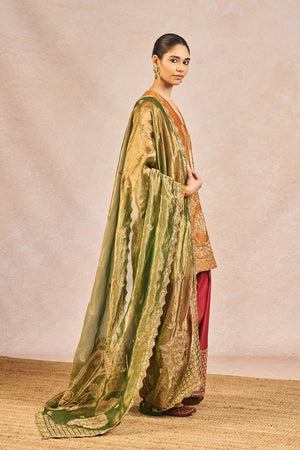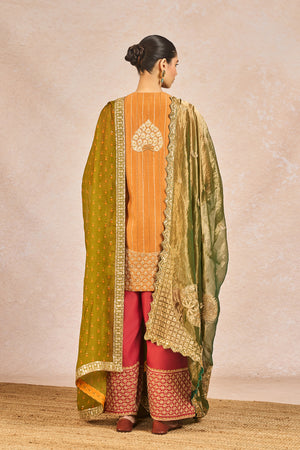 Description: The ‘GARAM MASALA’ SKD SET is a graceful fusion of traditional artistry and modern elegance. The kurta is embellished with intricate gold embroidery featuring signature 'Gul Jharoka Chaand' motif, while the matching pants showcase elaborate jaal work and a highlighted chaand motif, creating a harmonious blend of heritage and detail. The ensemble includes two dupattas for versatile styling—a crushed tissue dupatta with an embroidered scalloped border for added richness, and a printed dupatta finished with delicate green lace and subtle sitara kaam for a hint of festive sparkle—making it an ideal choice for celebratory occasions.