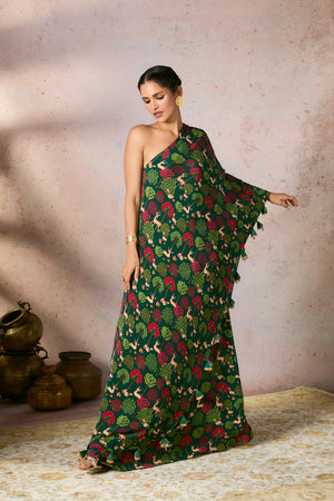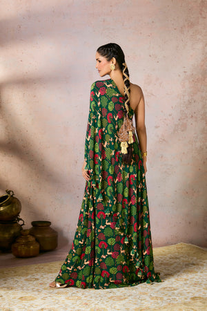 Details: Dress- Beautiful all over digital printed one shoulder dress | Side seam opening | Embellished with tassel detail.