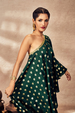 Details: Tunic- Foil printed one shoulder asymmetrical tunic | Flared Sleeve | Asymmetrical | Edged with embroidered borders and kinari gota Pant- Green straight pants embellished with embroidered border at the hem | Side seam closure