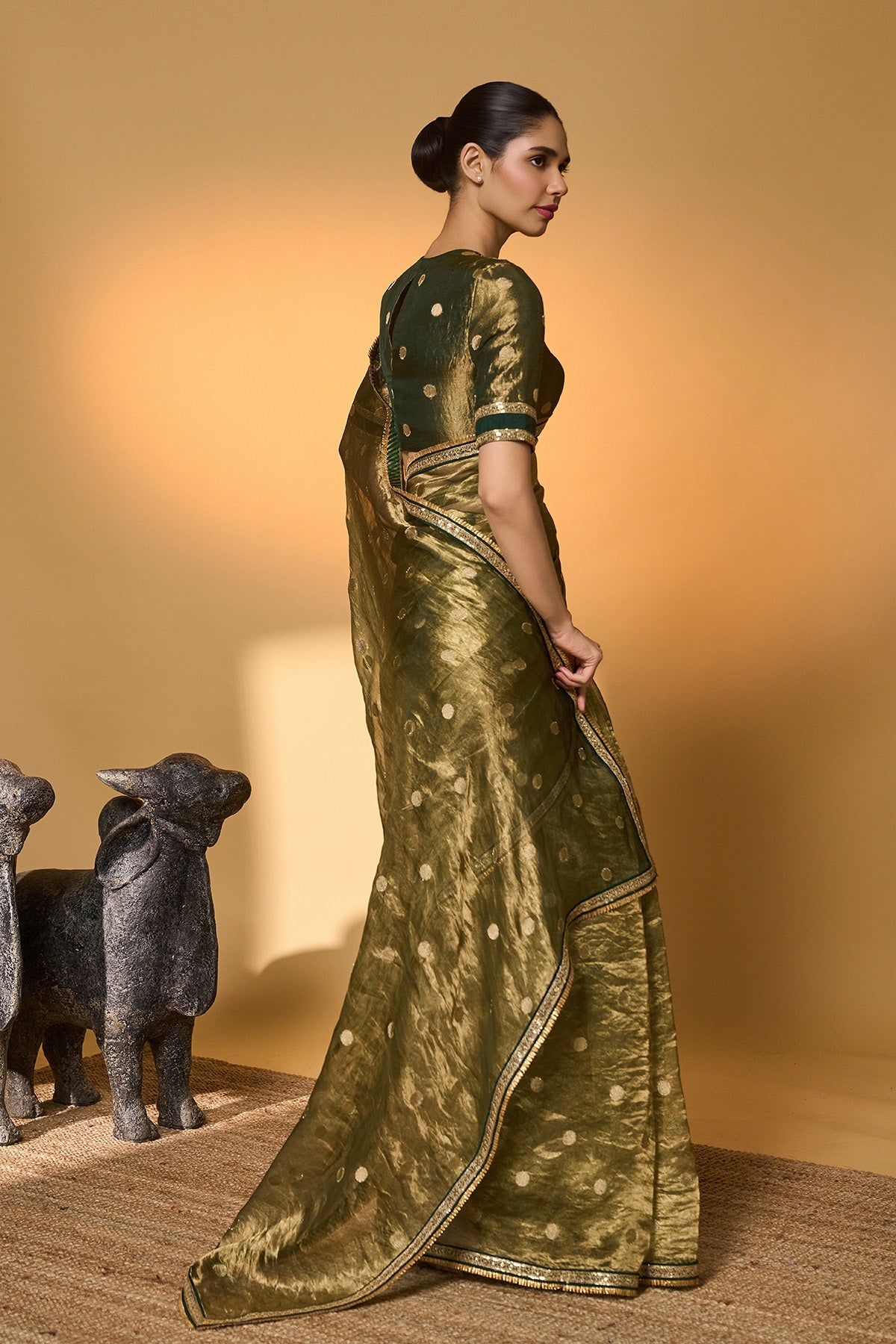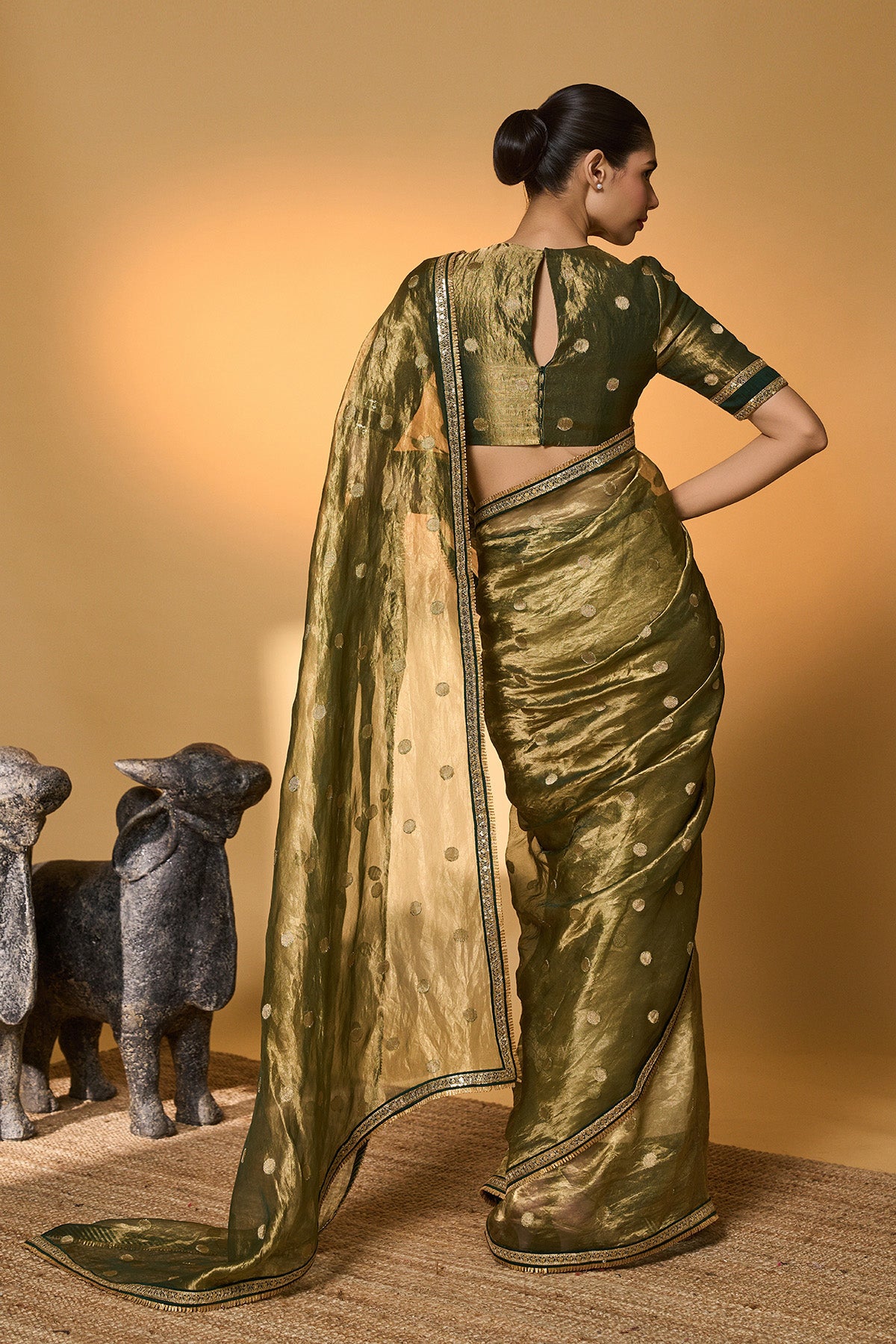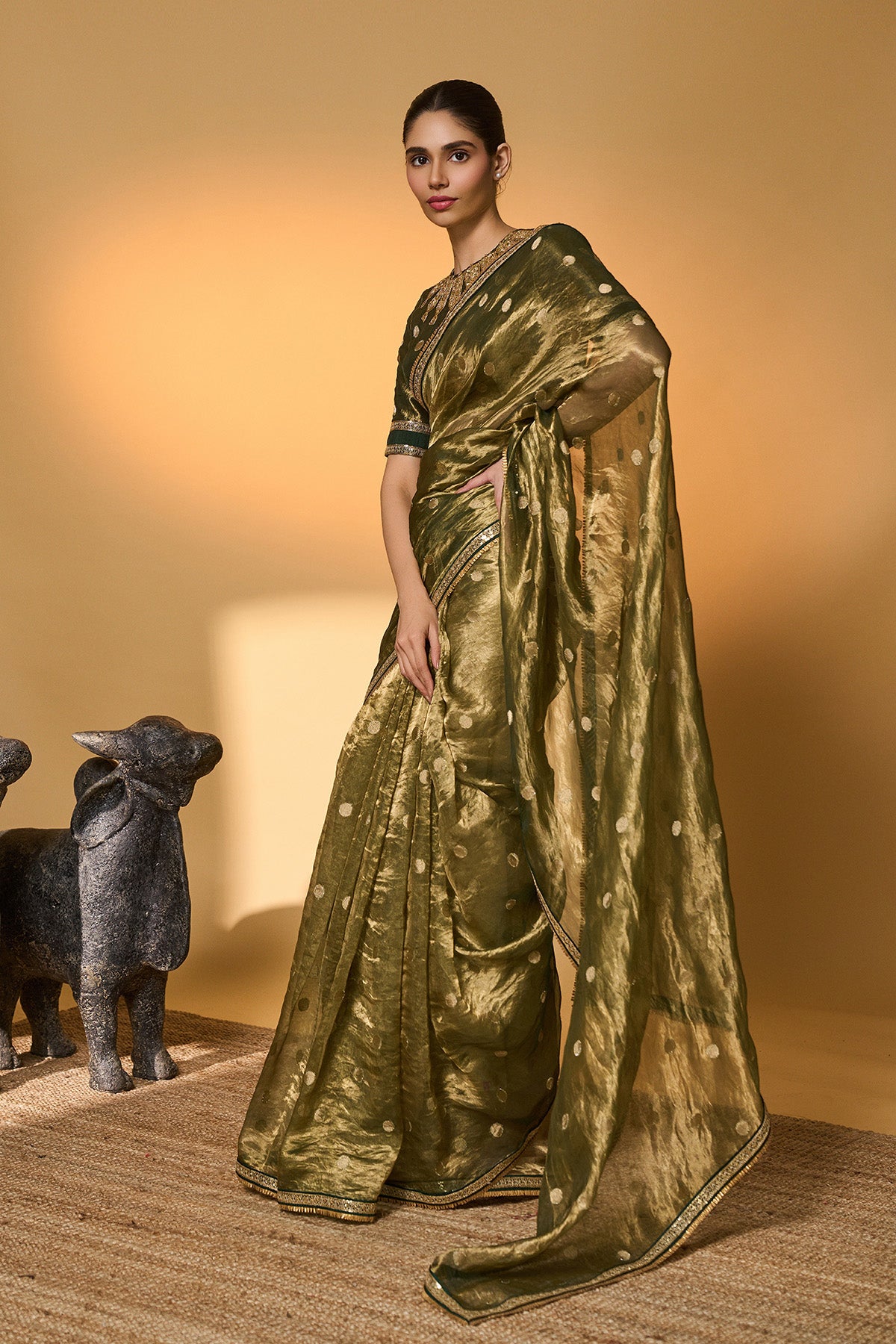 Details: A polka tissue saree featuring a soft sheen and an elegant, fluid drape. An ornate border frames the saree, enhancing its structure and finish. It is paired with a matching blouse designed with embroidery detailing on the neckline.