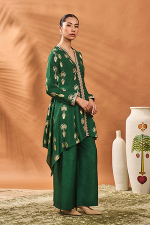 Details: Tunic- Beautiful foil printed assymetrical tunic | Adorned with embroidered borders around neckline and sleeves | 'V' neckine | Full Sleeves | Side seam closure Pant- Rust straight pants | Side seam closure
