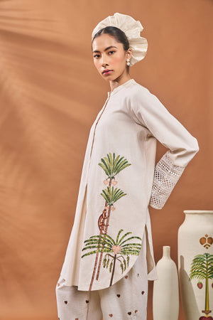 Details: Tunic- All over printed tunic |A-line| 'V' neckline and sleeves hem adorned with hand embroidery Pant- Green straight pants | Side seam closure