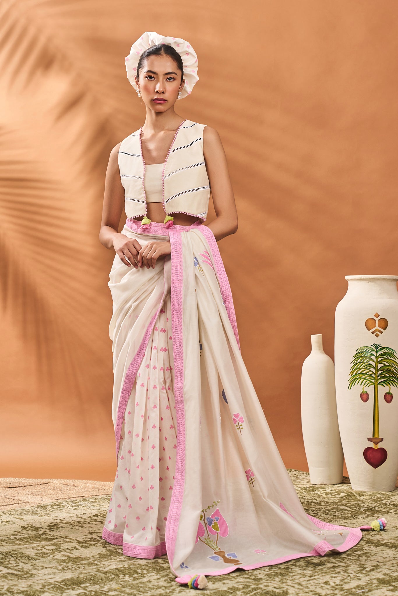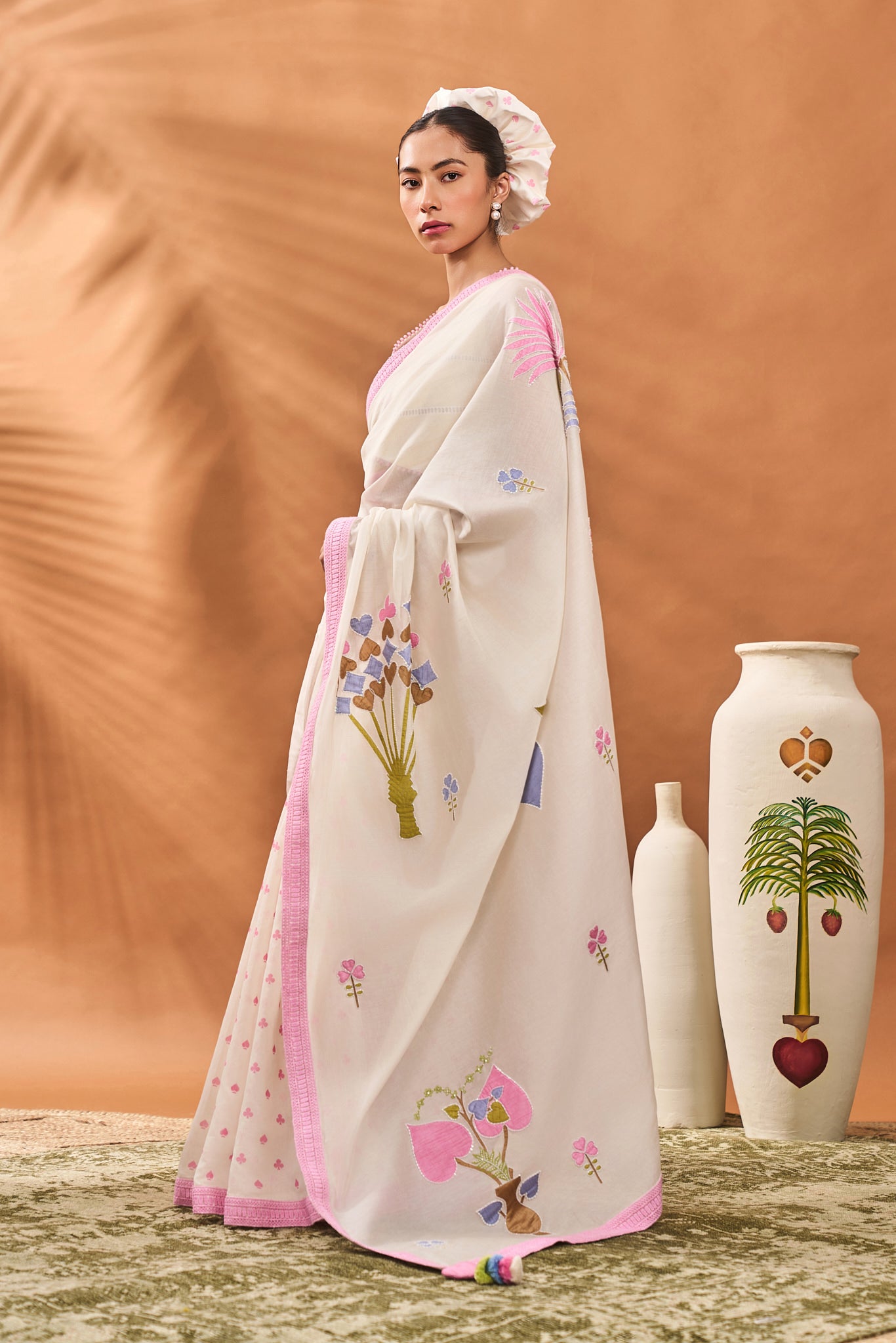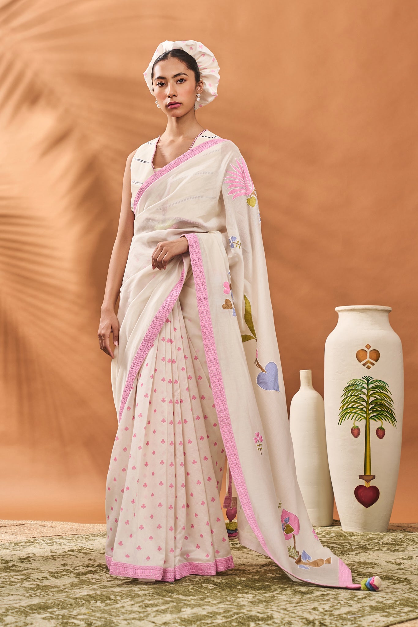 Details: Saree- Beautiful printed saree with pink all fours khadi print | Palla is adorned with applique embroidery with highlight | Embellished with crochet borders and tassles