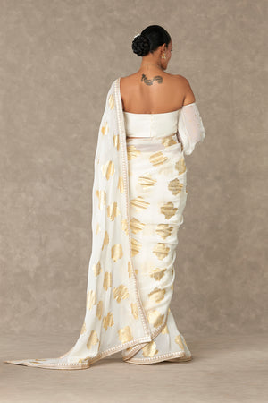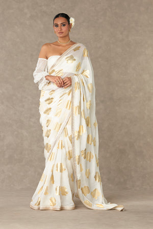 Details: Ivory Organza Saree - Signature Gulaab gold foil printed saree | Embellished with borders Blouse Piece- Half and half raw silk and organza gold foil printed blouse piece
