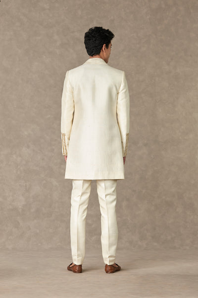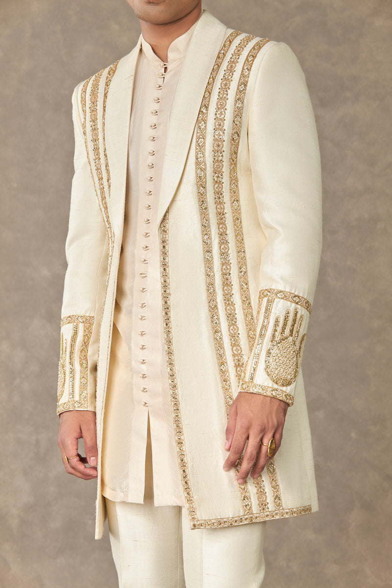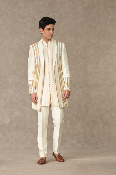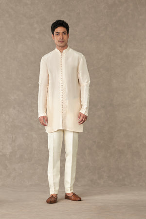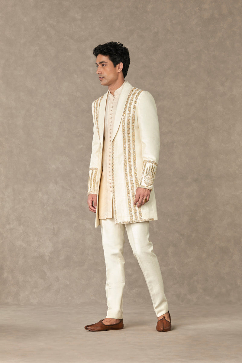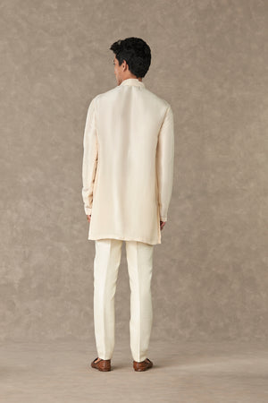 Styling: Style the classic raja koti with our button down Ivory Kurta for men, ankle pants and mojris