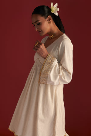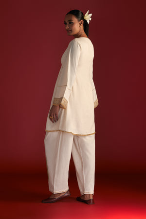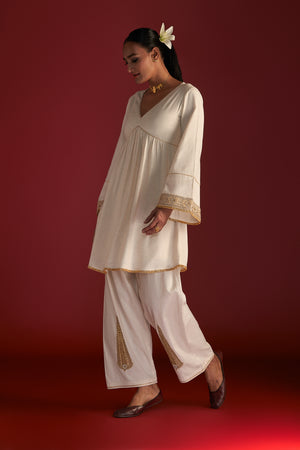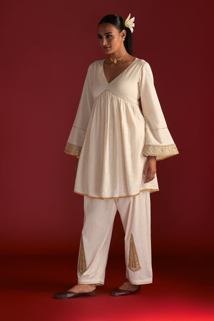 Details: Ivory 'Paan-Patti' Salwar Set - Kurta with gathers & hemline edged with jhallar | Bell Sleeves embellished with border | Salwar embroidered with signature 'Paan-Patti' motif