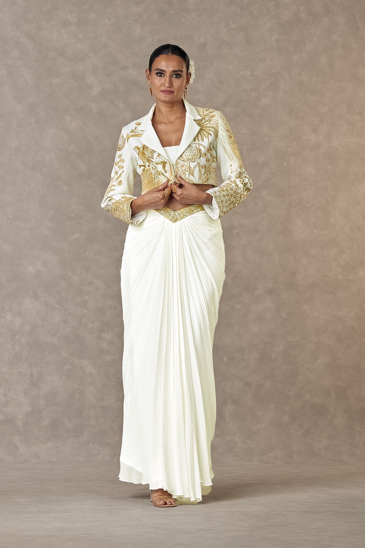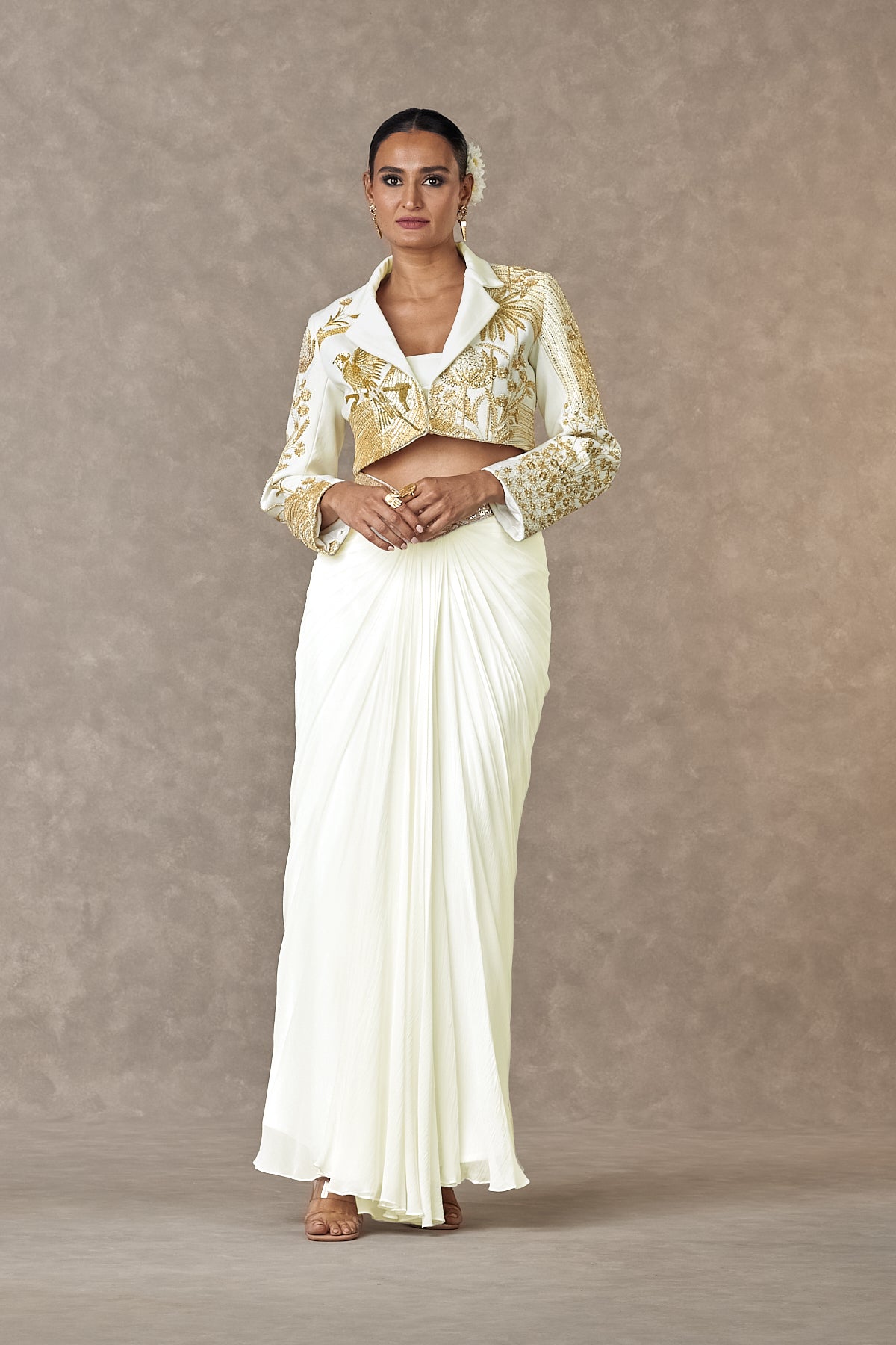 Details: Ivory Cropped Blazer Set - Son-Chidiya Cropped blazer embroidered with moti, dori & sitara kaam |Full sleeve | Notch collar | Centre front closure Drape Skirt - Drape skirt with 'V' shaped waist belt| Waist belt embroidered with dori & sitara kaam| Centre back closure Tube - Ivory fitted tube with Center back closure | Comes with detachable strap